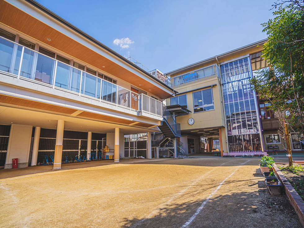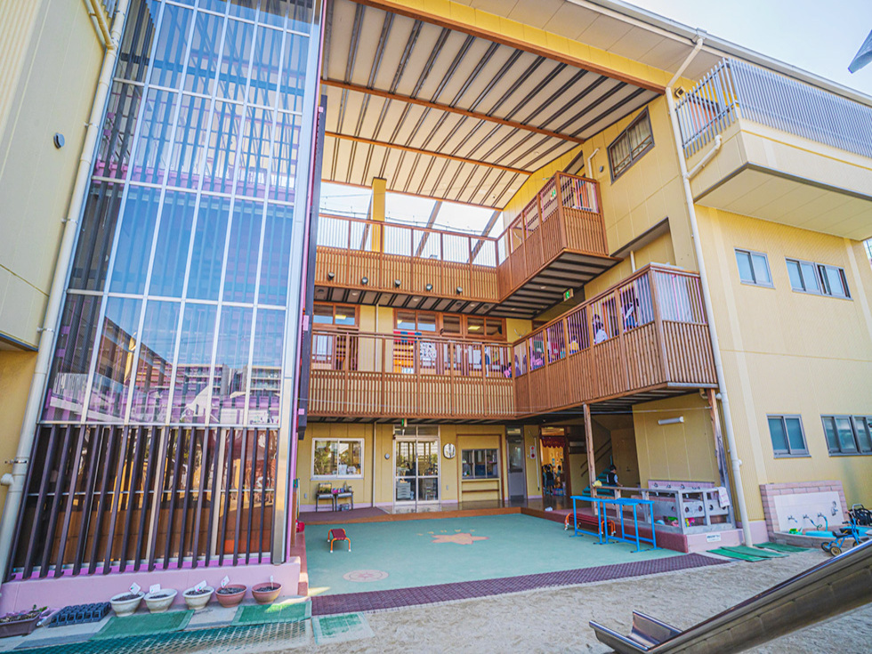 木材をふんだんに取り入れた園舎は、都会の中に居ながらも、木の温もりを感じながら過ごすことができます。普段あまり自然に触れる機会の少ないこの地域の子どもたちを想い、「自然に接して大きく伸び伸びと成長して欲しい」との想いから可能な限り木材を使用しての設計となっています。