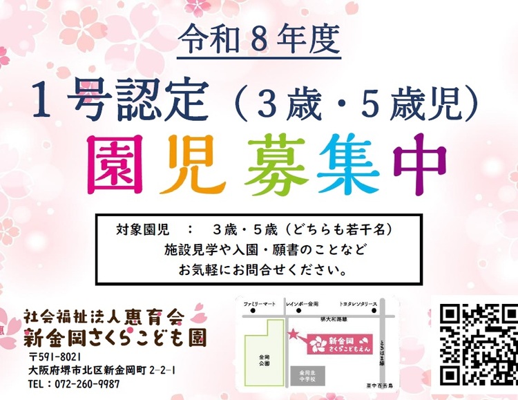 令和8年度1号認定(3歳、5歳)の入園枠につきまして、若干名の空きがございます。